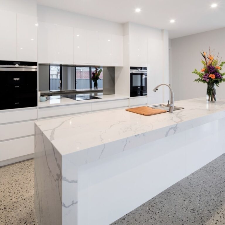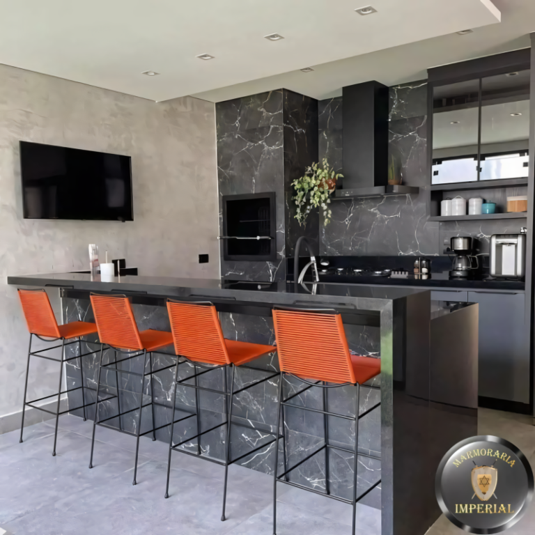 Ilha central com pedra premium, ideal para preparo e integração de ambientes.